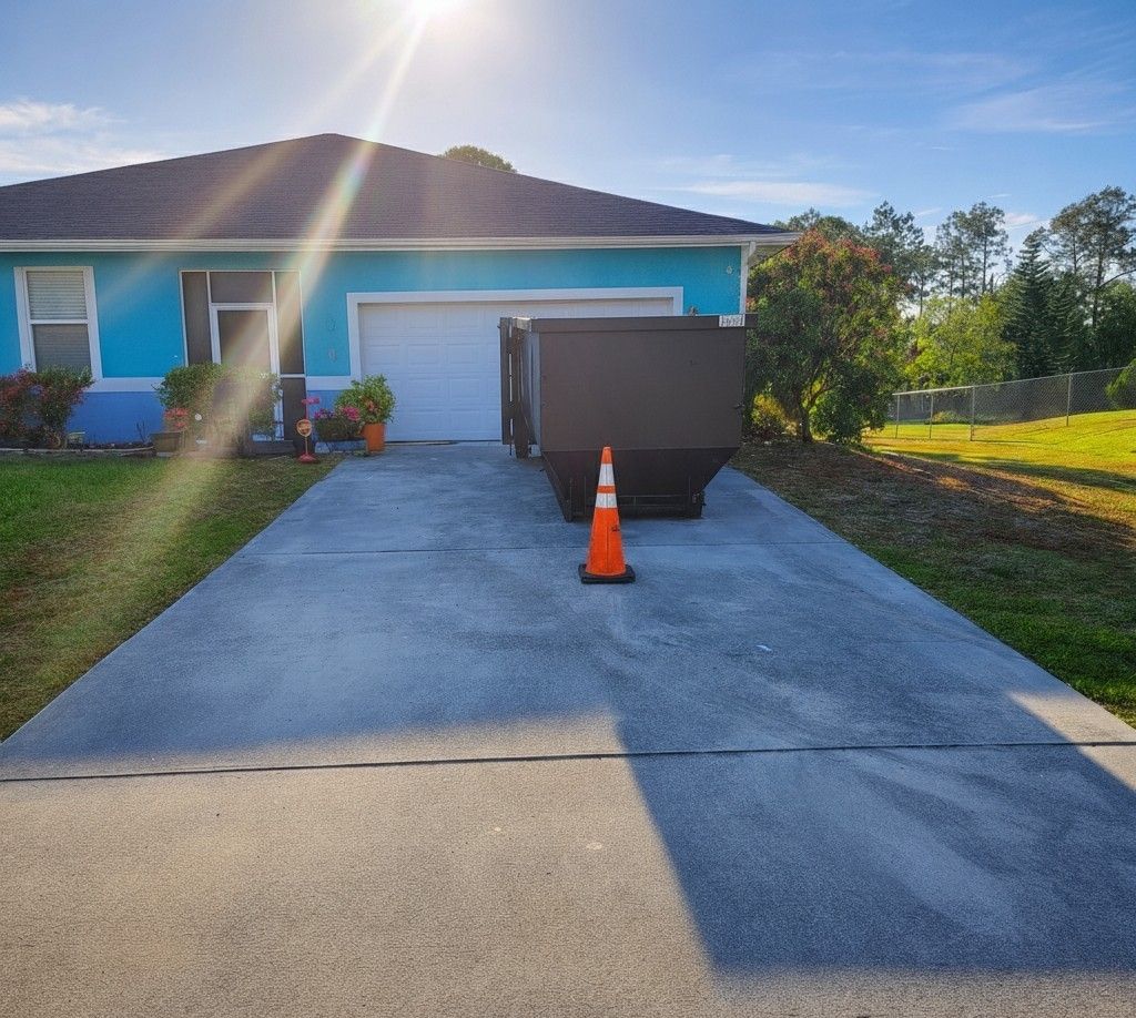 Residential dumpster rental delivery in Cape Coral Florida by Silverback Dumpster Rentals. Roll-off dumpster placed in driveway for home cleanout and renovation debris removal. Serving Lee County homeowners and contractors.